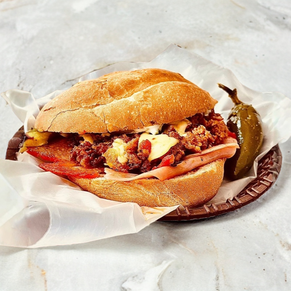 Con Jamón y chorizo. Preparada con frijoles, crema, jitomate, cebolla y aguacate.