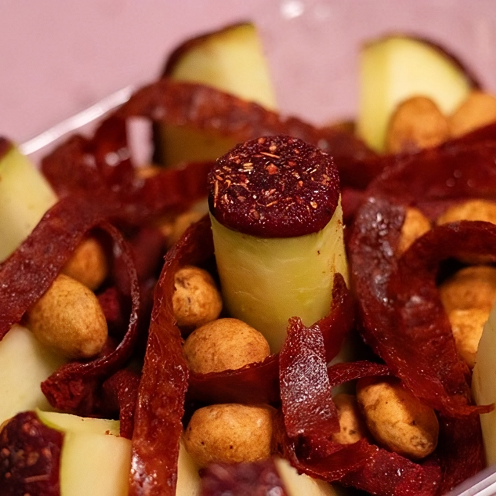 Manzana granny 250 gr/ Cubierta Tamarindo / Escarchada de Chamoy en Polvo / Chamoy Liquido / Gomas a elegir / Mezcla de Cacahuates Japoneses y Snacks.