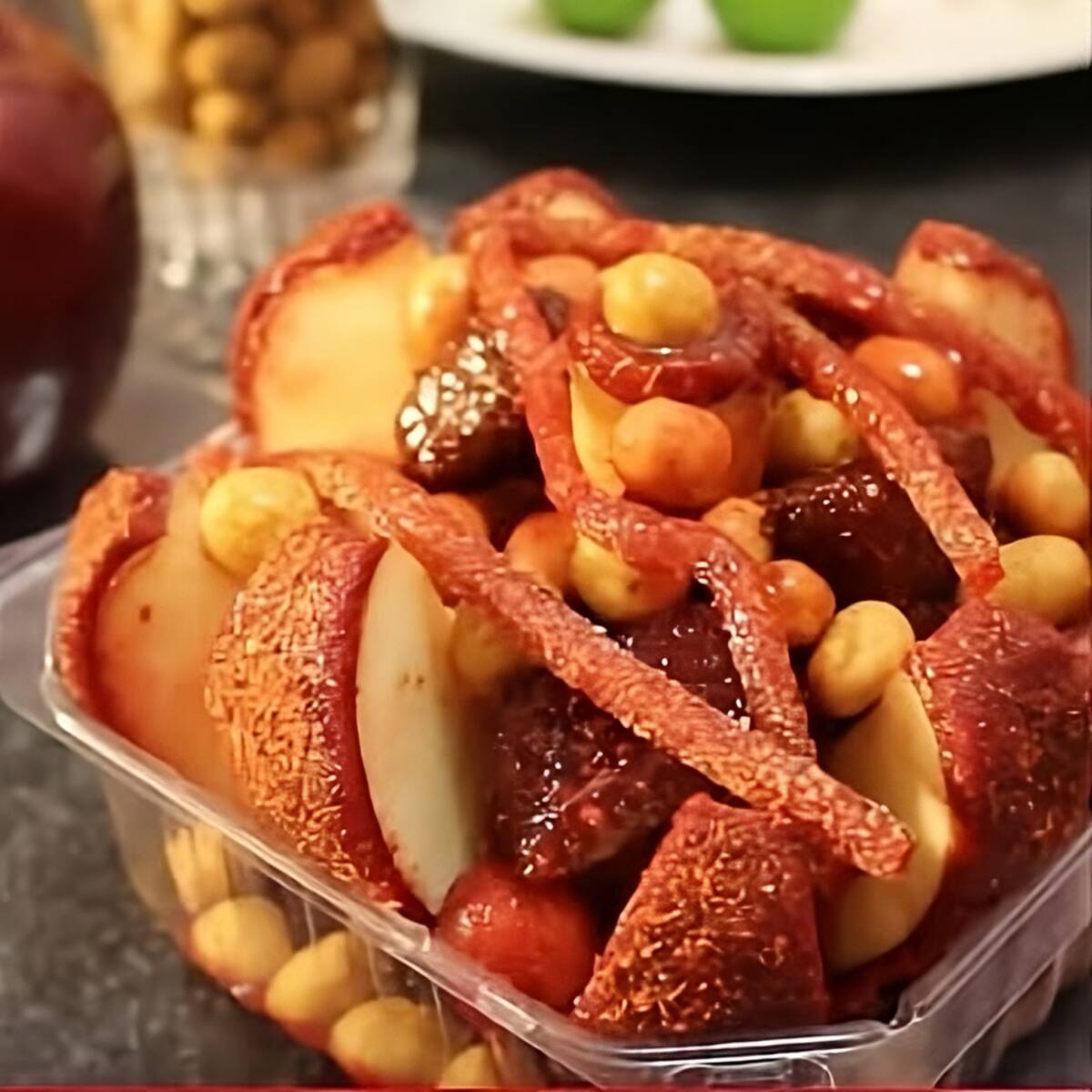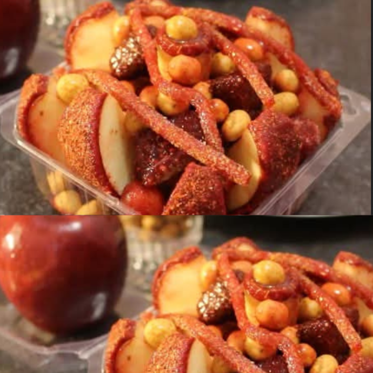*2 La Gran Manzana: Manzanas granny 250 gr/ Cubiertas Tamarindo / Escarchadas de Chamoy en Polvo / Chamoy Liquido / Gomas a elegir / Mezcla de Cacahuates Japoneses y Snacks.