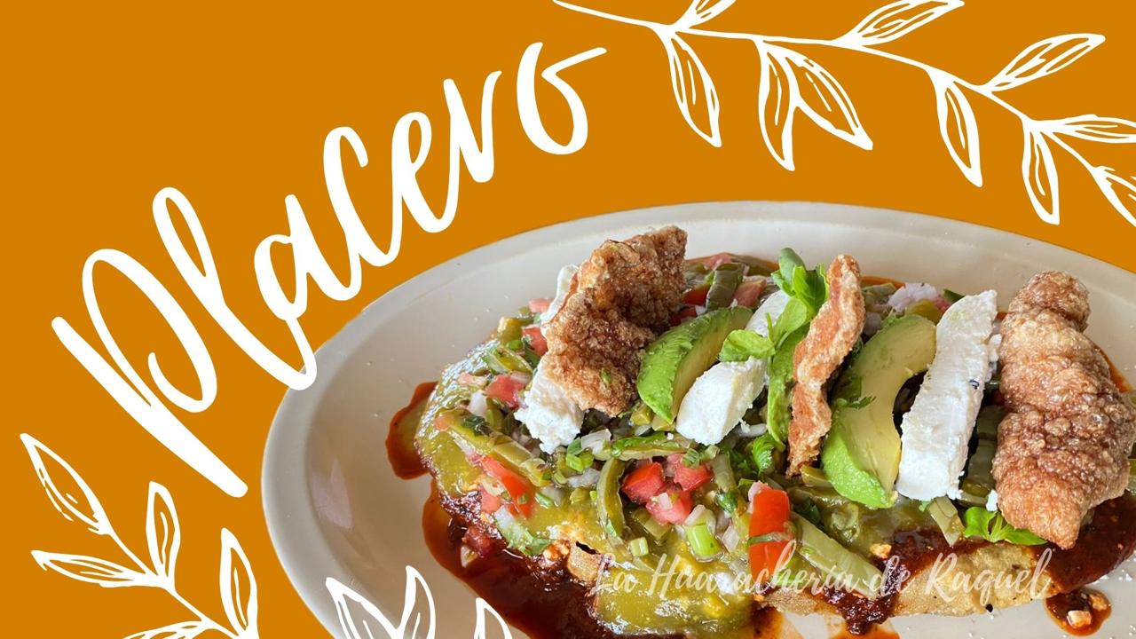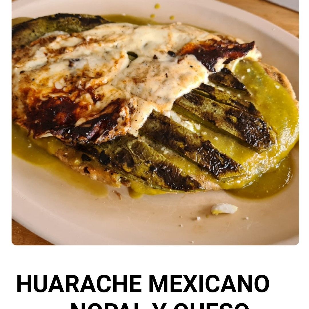 Exquisito huarache tradicional (14 cm) de masa relleno de frijoles acompañado de nopalitos, aguacate, queso doble crema, chicharrón, pápalo y salsa aparte.