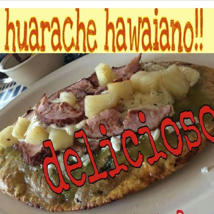 Exquisito huarache tradicional (24 cm) de masa relleno de frijoles acompañado de pierna española, queso fundido y piña y salsa aparte.