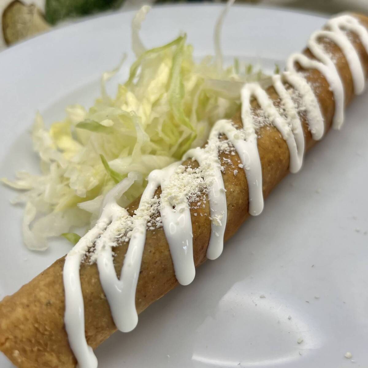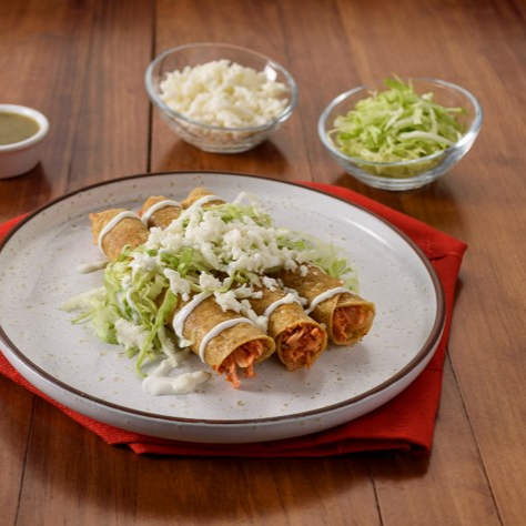 Dos crujientes tacos dorados rellenos de pollo jugoso y bien sazonado, coronados con lechuga fresca, crema suave, queso rallado y salsa que realza su sabor casero.