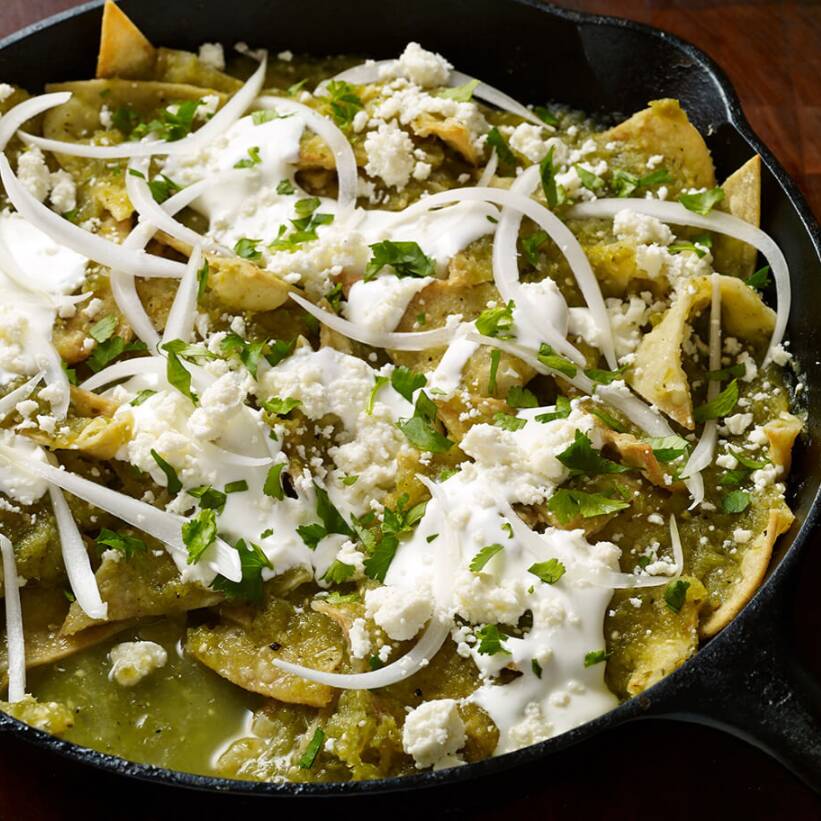 Totopos crujientes bañados en salsa verde, acompañados de pollo deshebrado, crema, queso fresco y cebolla. Un platillo casero y sabroso, perfecto a cualquier hora.