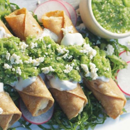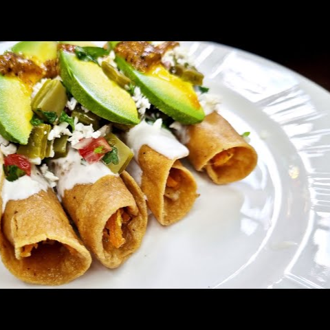 Dos tacos dorados rellenos de mole verde fresco con pollo tierno, acompañados de lechuga, crema, queso y salsa que dan un toque tradicional y refrescante.