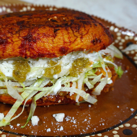 Pambazo individual bañado en salsa de guajillo y doradito, relleno de pollo en mole verde casero. Servido con lechuga fresca, crema y queso rallado. ¡Un giro verde al antojo de siempre!