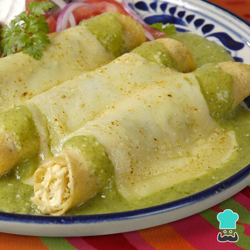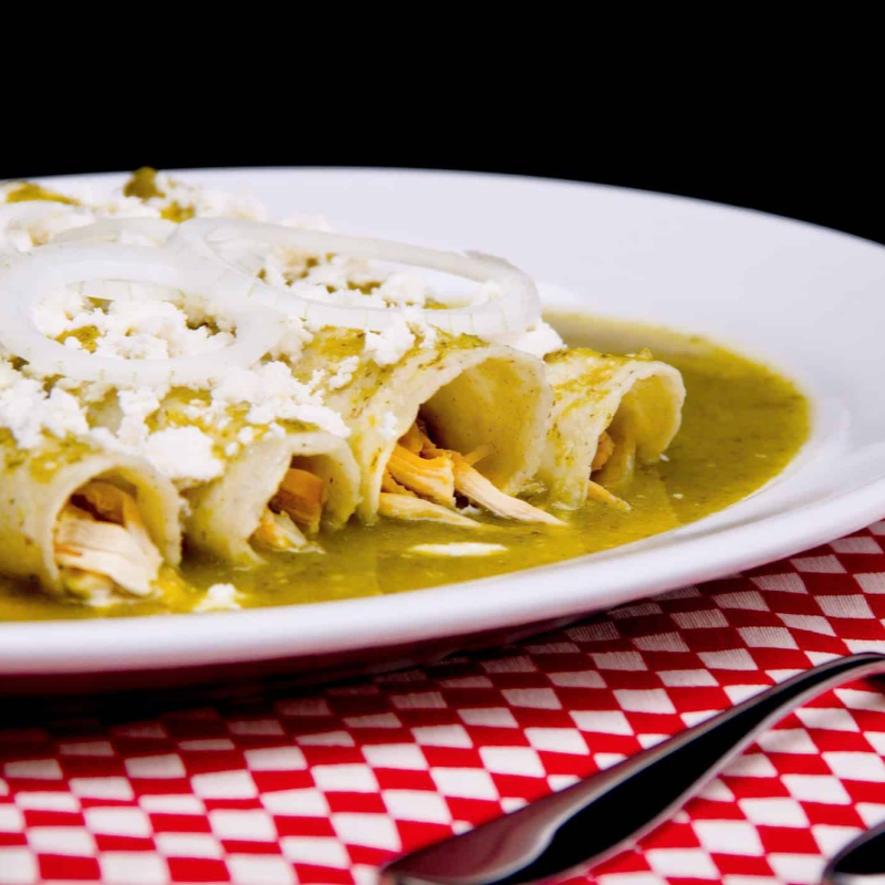 Cuatro tortillas suaves bañadas en salsa verde, rellenas de pollo deshebrado y cubiertas con crema, queso fresco y cebolla. Un clásico lleno de sabor.