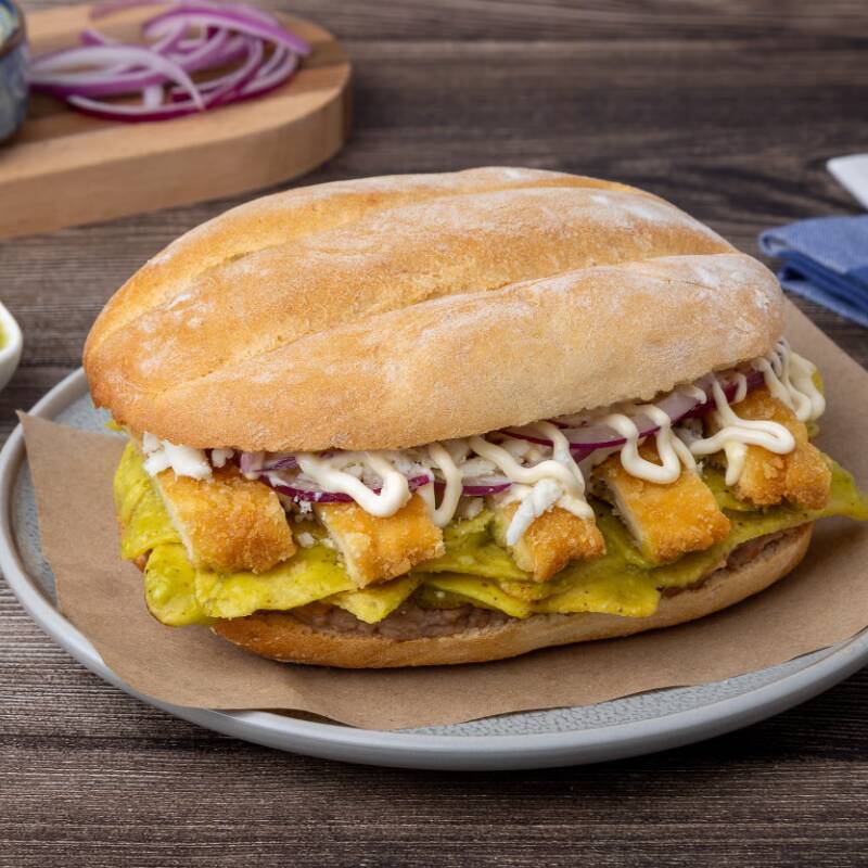 Crujiente milanesa empanizada, servida en bolillo fresco y suave, acompañada de jitomate, lechuga, aguacate, frijoles y mayonesa. Un clásico que conquista a cada mordida.
