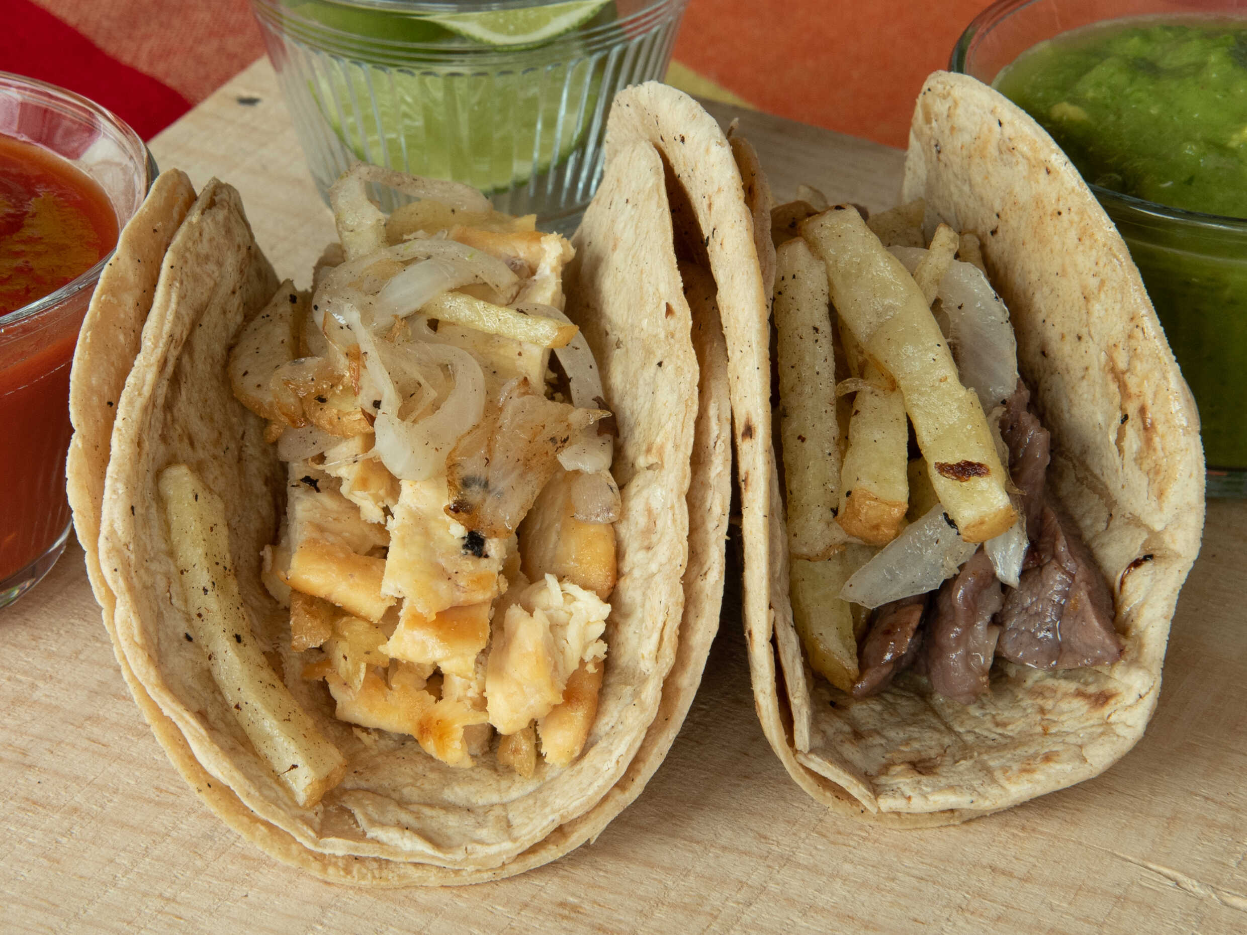 Tortillas de harina rellenas de chorizo y queso oaxaca acompañada de limón y salsa