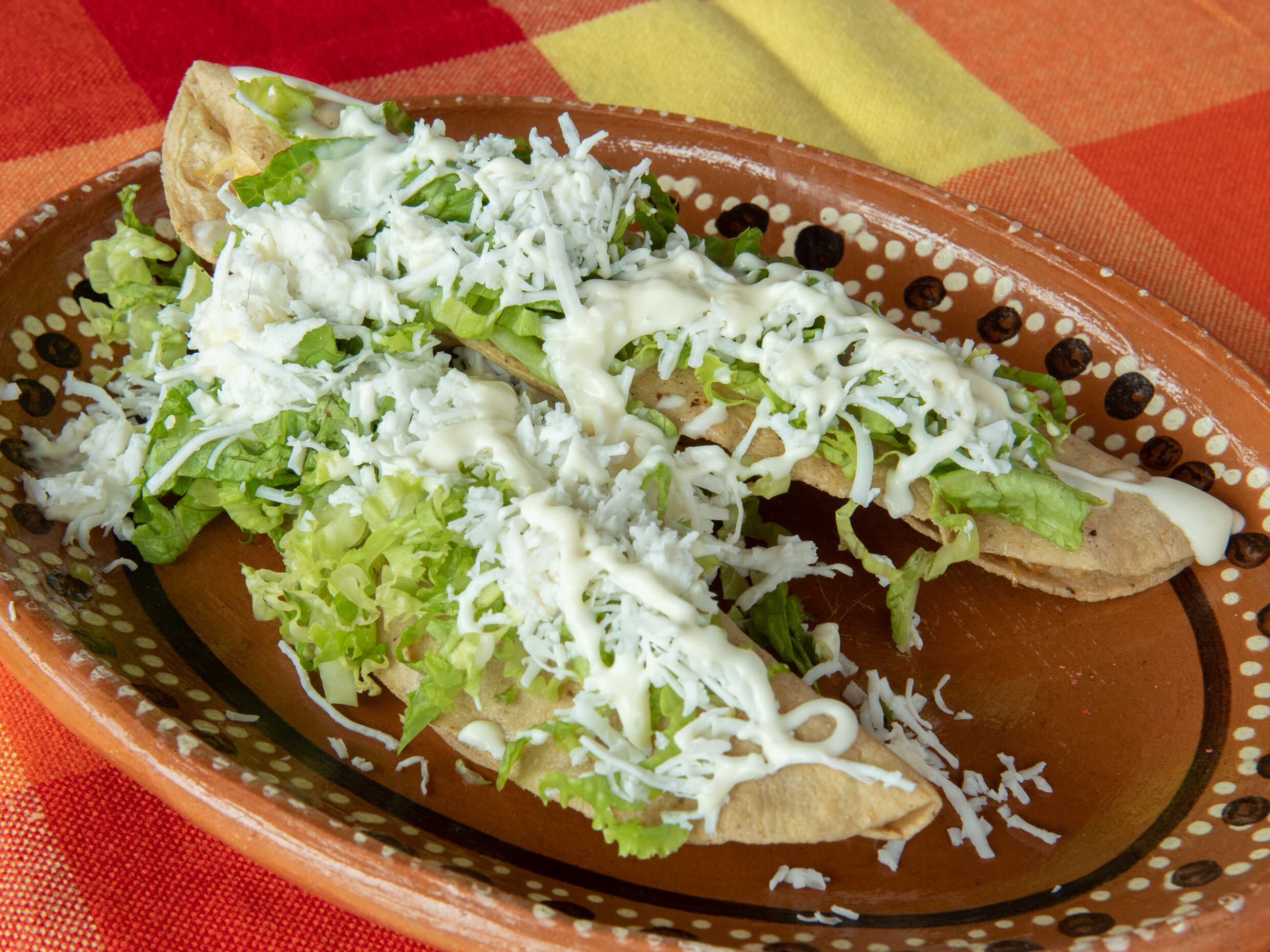 Orden de 3 pzas. Crujientes tacos dorados rellenos de guisado con cobertura de lechuga, crema y queso.
