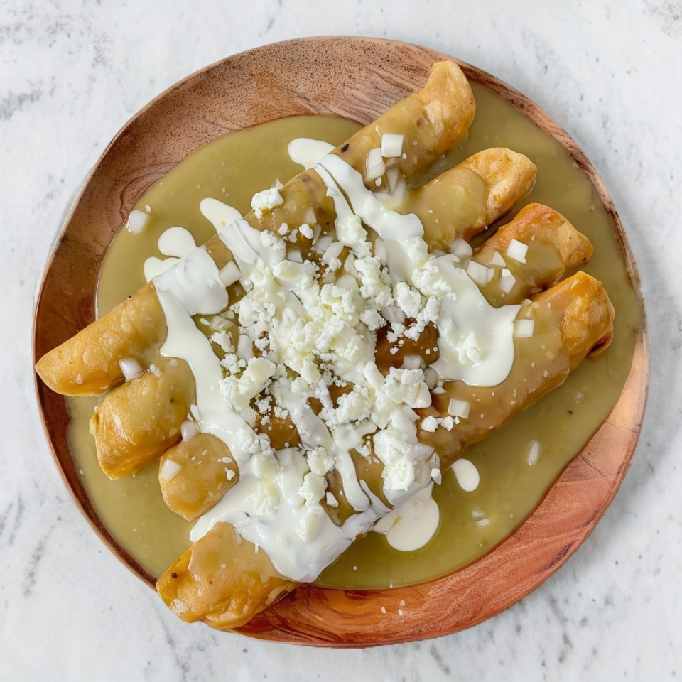 Orden de 3 pzas. Crujientes tacos dorados rellenos de guisado, bañados en salsa verde con cobertura de lechuga, crema y queso.