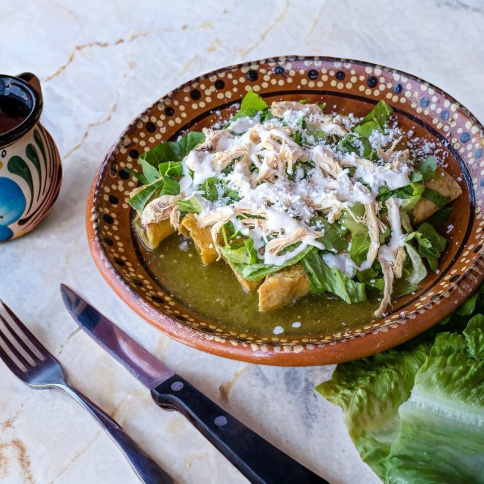 Totopos dorados bañados en salsa verde, elige tu proteina acompañados de crema y queso rallado