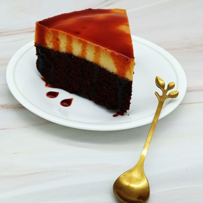 Delicioso pastel de chocolate con flan de leche