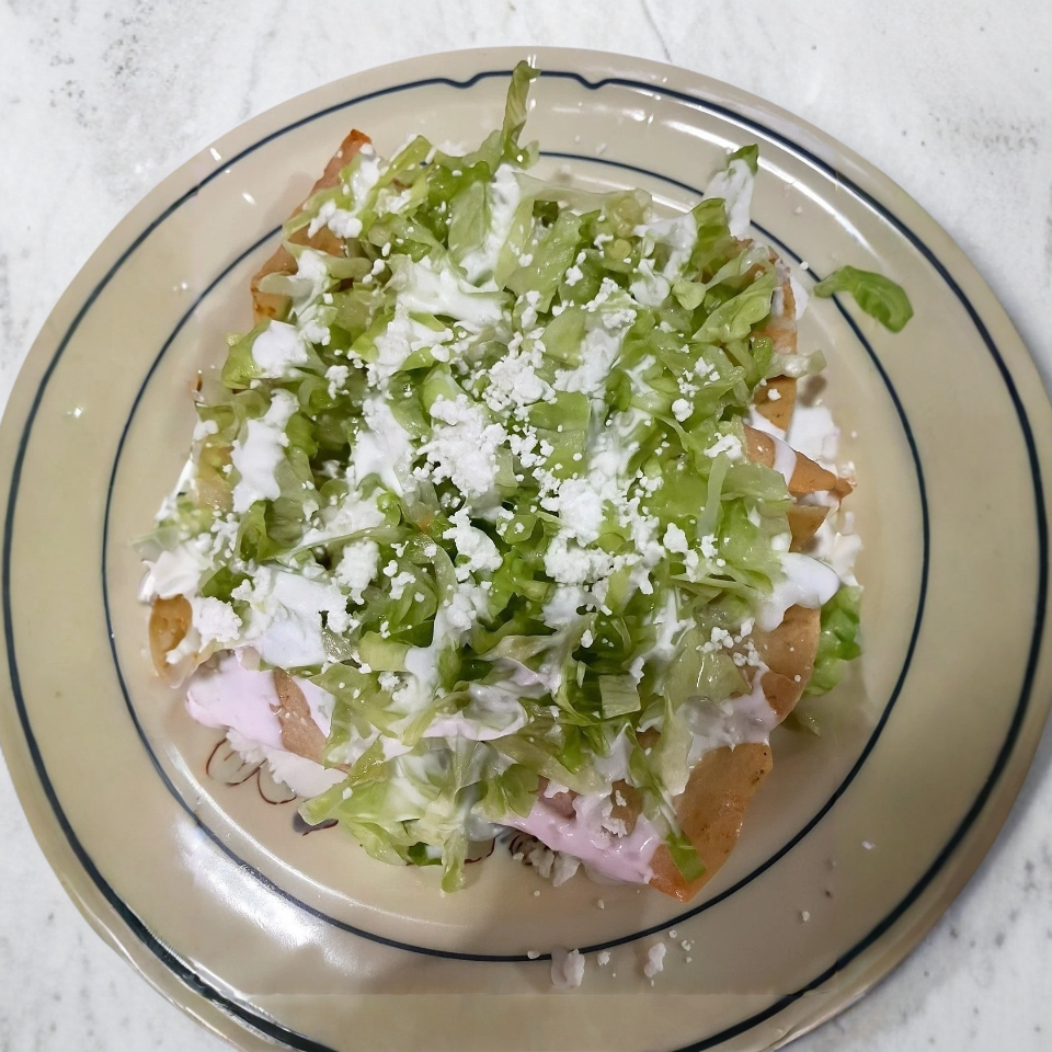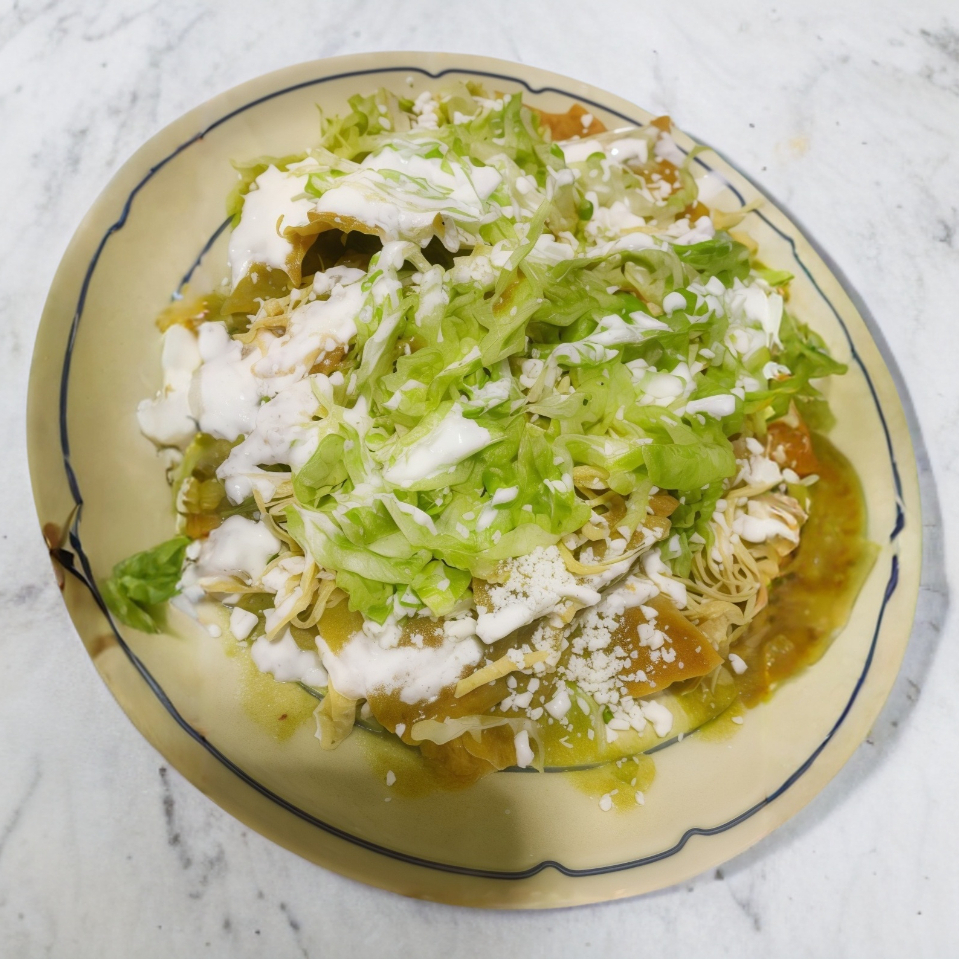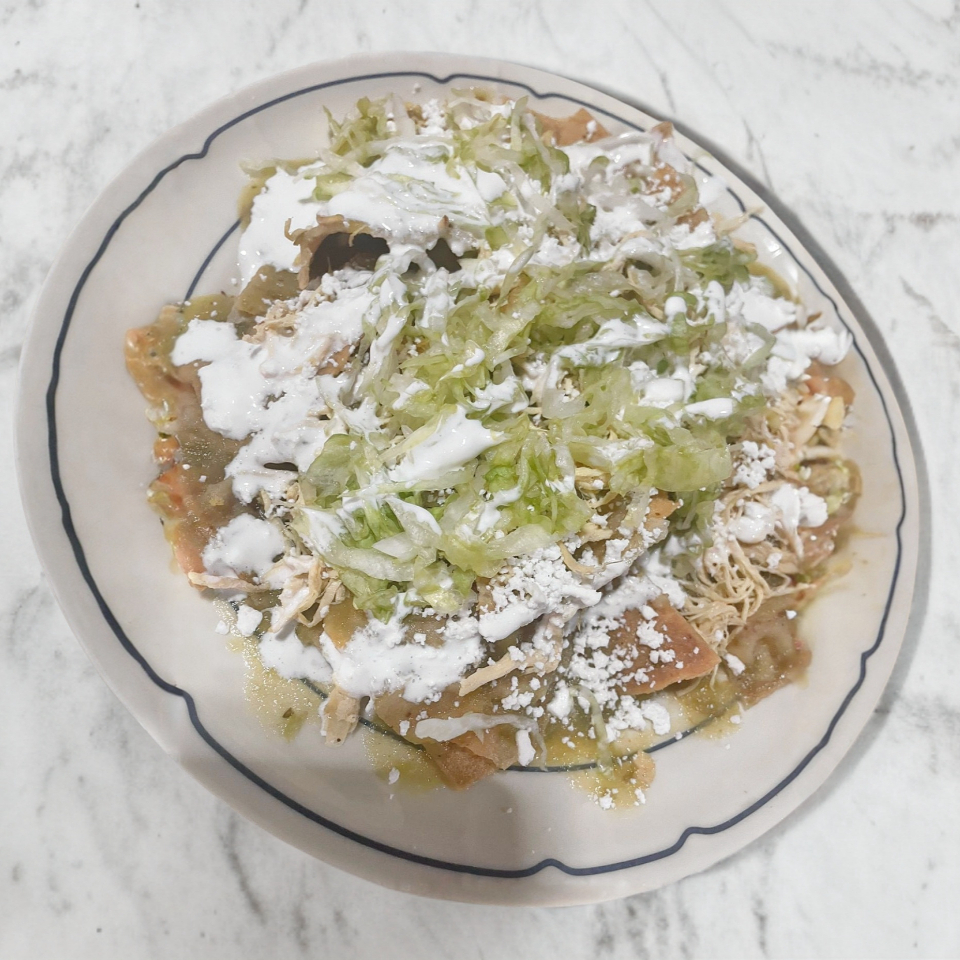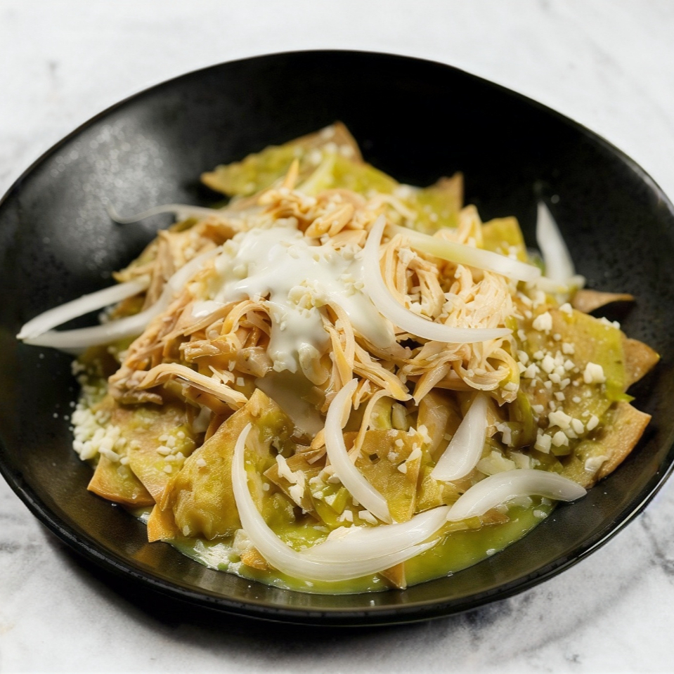 Crujientes totopos bañados en salsa verde, acompañados de pollo, queso fresco, lechuga y cremosa crema.