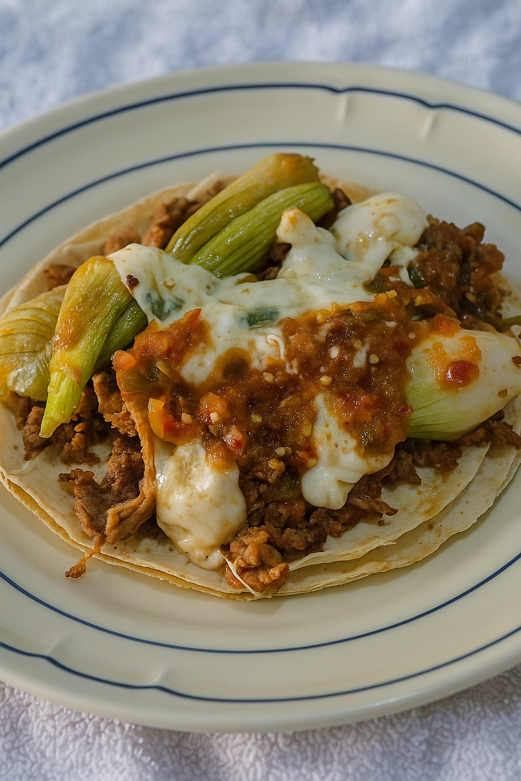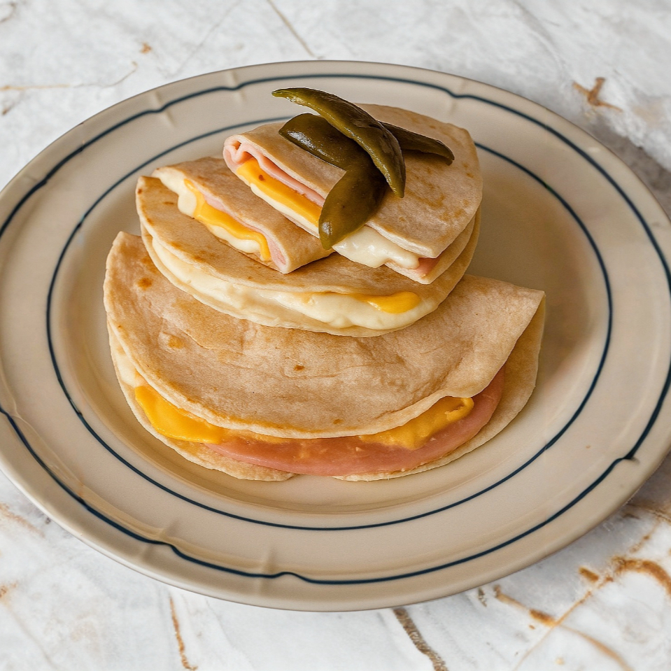 Tres tortillas de harina doraditas al comal, rellenas de jamón, queso oaxaca y queso amarillo, perfectas para compartir.