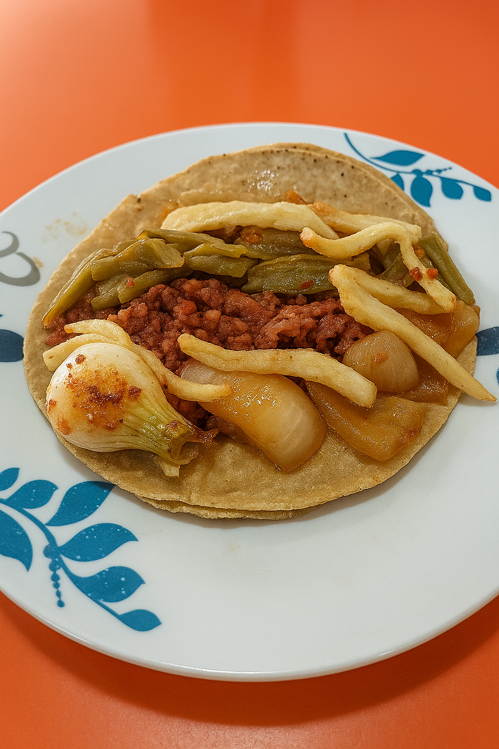 Taco de tortilla suave relleno de jugosa longaniza con papas, nopales y cebolla, lleno de sabor tradicional.
