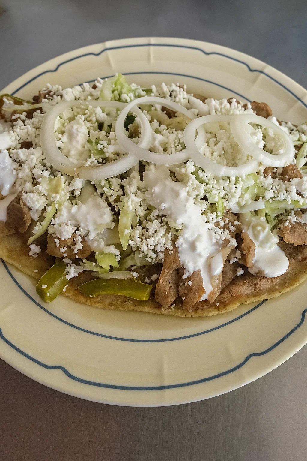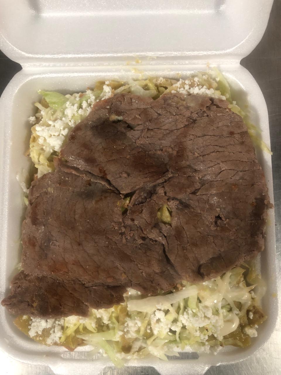 Delicioso huarache con frijoles, bistec de res, nopales, queso, crema, lechuga y cebolla. Un auténtico antojito lleno de sabor.