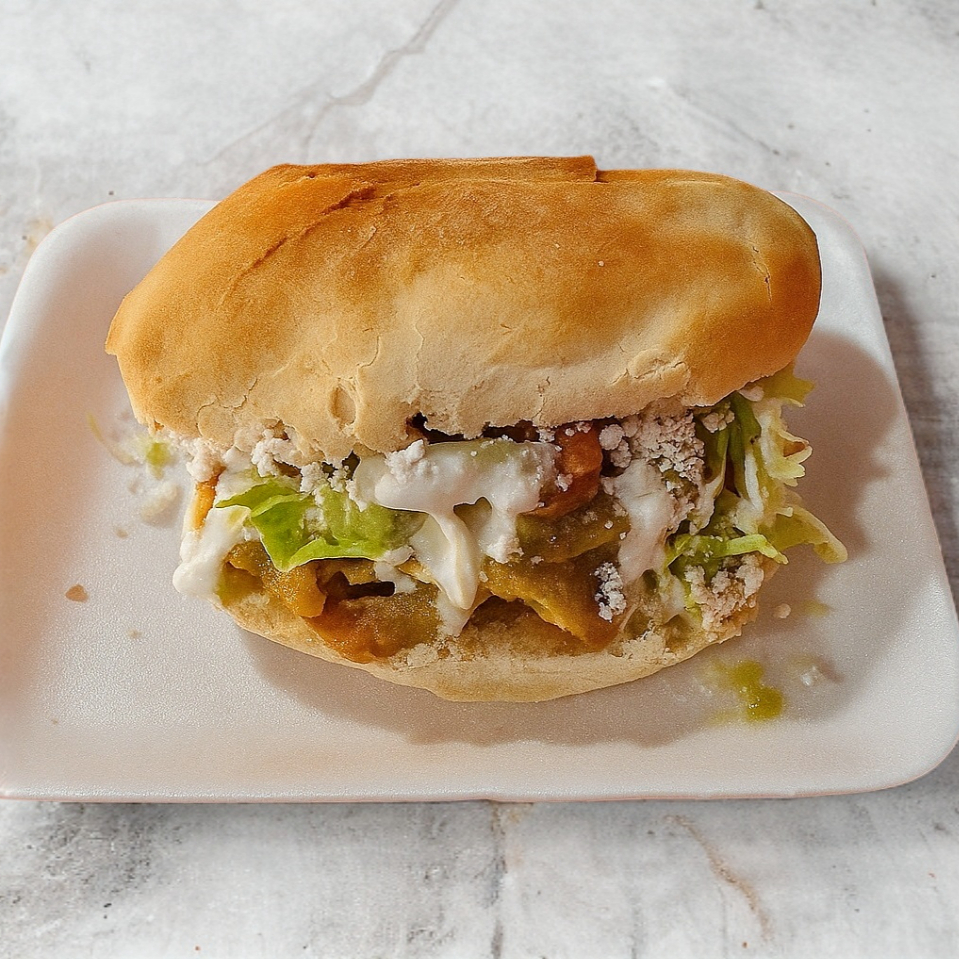 Pan telera relleno de milanesa, salchicha, queso, aguacate, jitomate, mayonesa y un toque de picante que despierta todos tus sentidos.