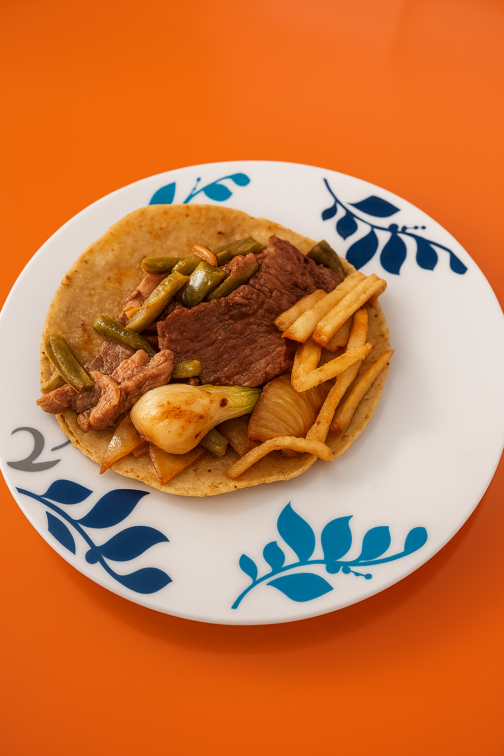 Taco de tortilla con bistec tierno, acompañado de papas, nopales y cebolla, un clásico que siempre conquista.