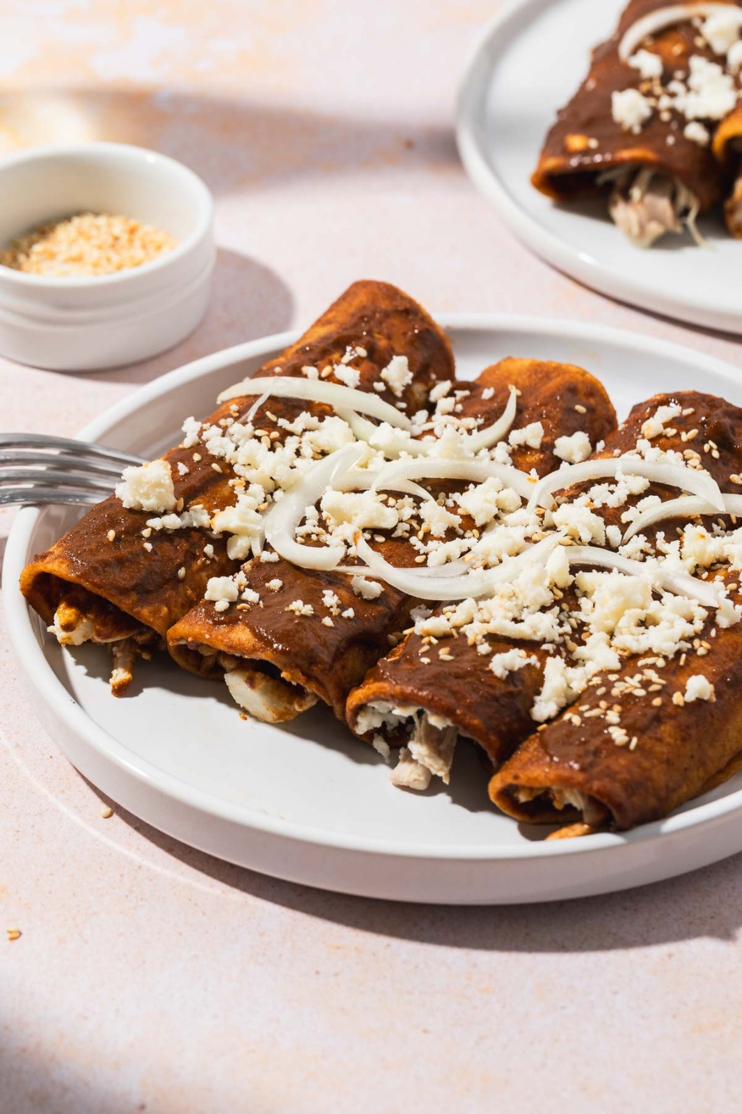 Tortillas rellenas de pollo, bañadas en mole casero, con un toque de queso, lechuga y crema que enamora.
