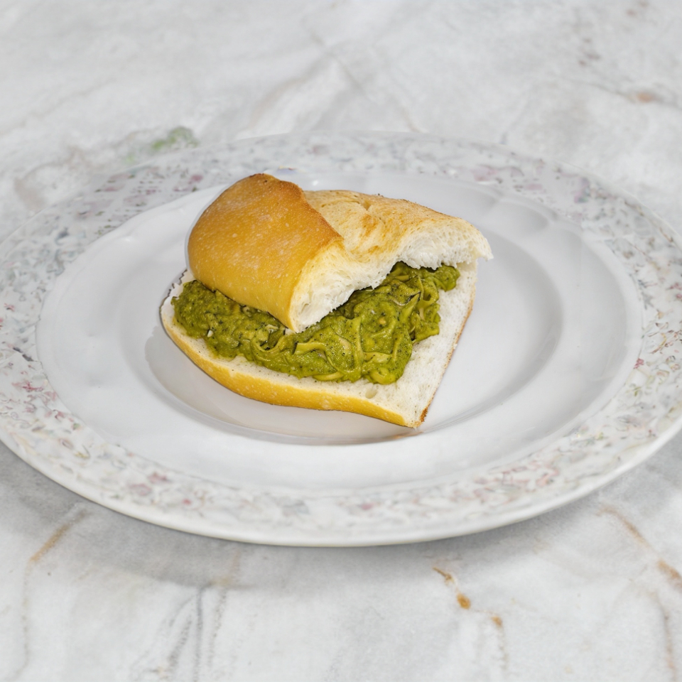 Pan telera relleno de mole verde casero con pollo, lleno de sabor auténtico.