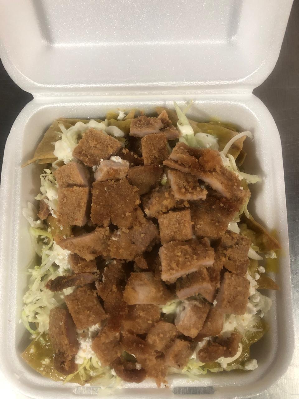 Totopos bañados en salsa verde, acompañados de milanesa,queso, crema, lechuga ( telera de cortesía)