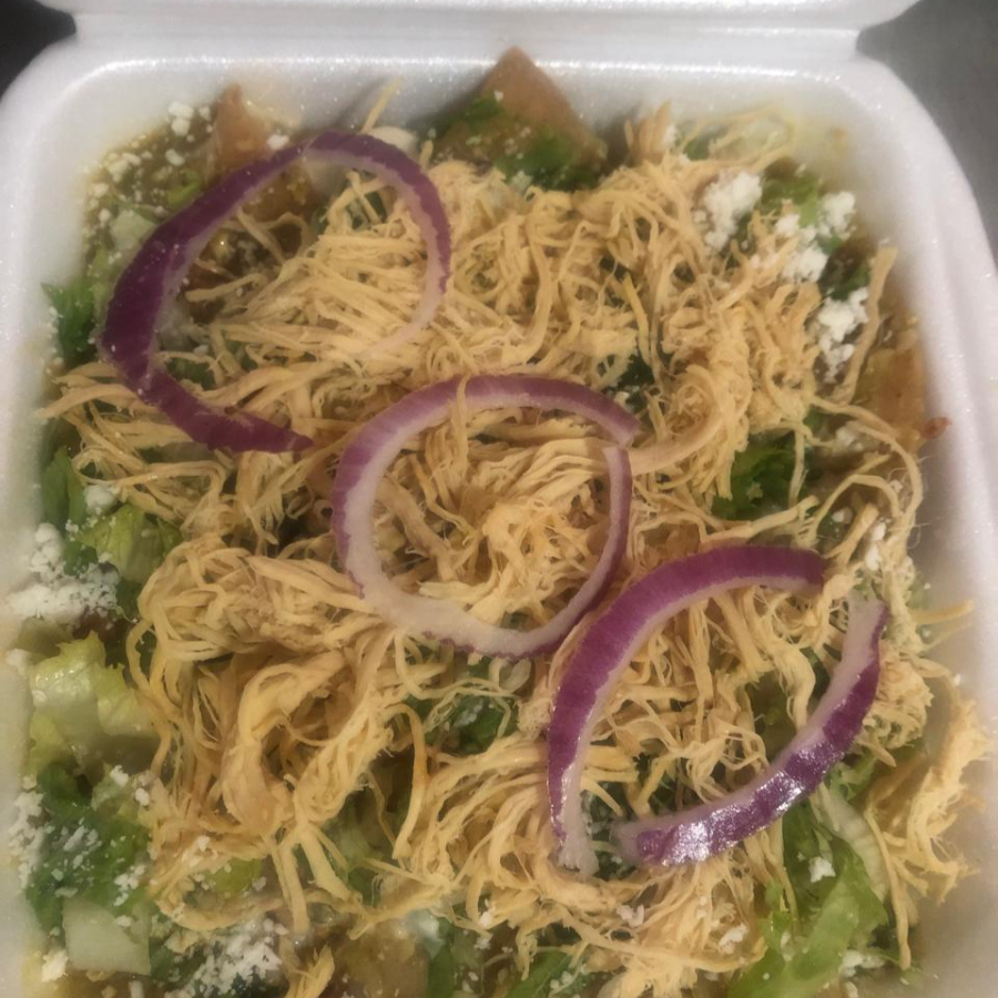 Tortilla doradita bañada en salsa verde , acompañada con pechuga deshebrada, lechuga, crema,queso adicional una telera