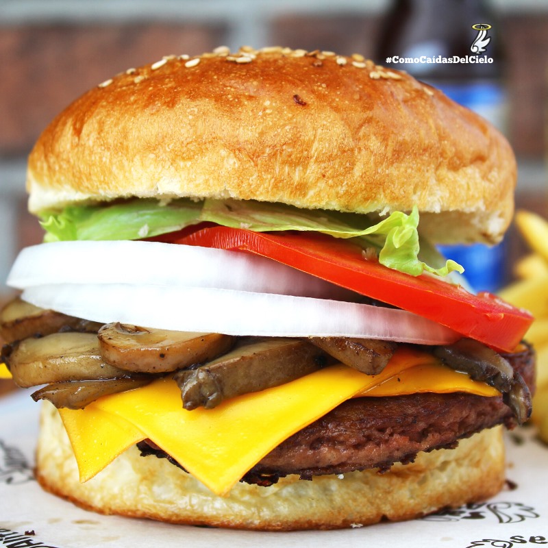 Hamburguesa acompañada con queso amarillo, mozzarella, lechuga, jitomate, cebolla, champiñones, tocino y aderezo ranch, acompañada de 130 grs, papas a la francesa y un dip de catsup.
