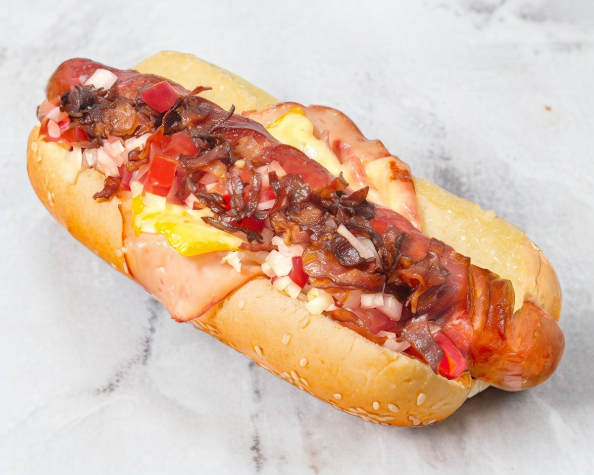 Salchicha de pavo, tocino, jitomate, cebolla, picante, cátsup, mayonesa y mostaza.