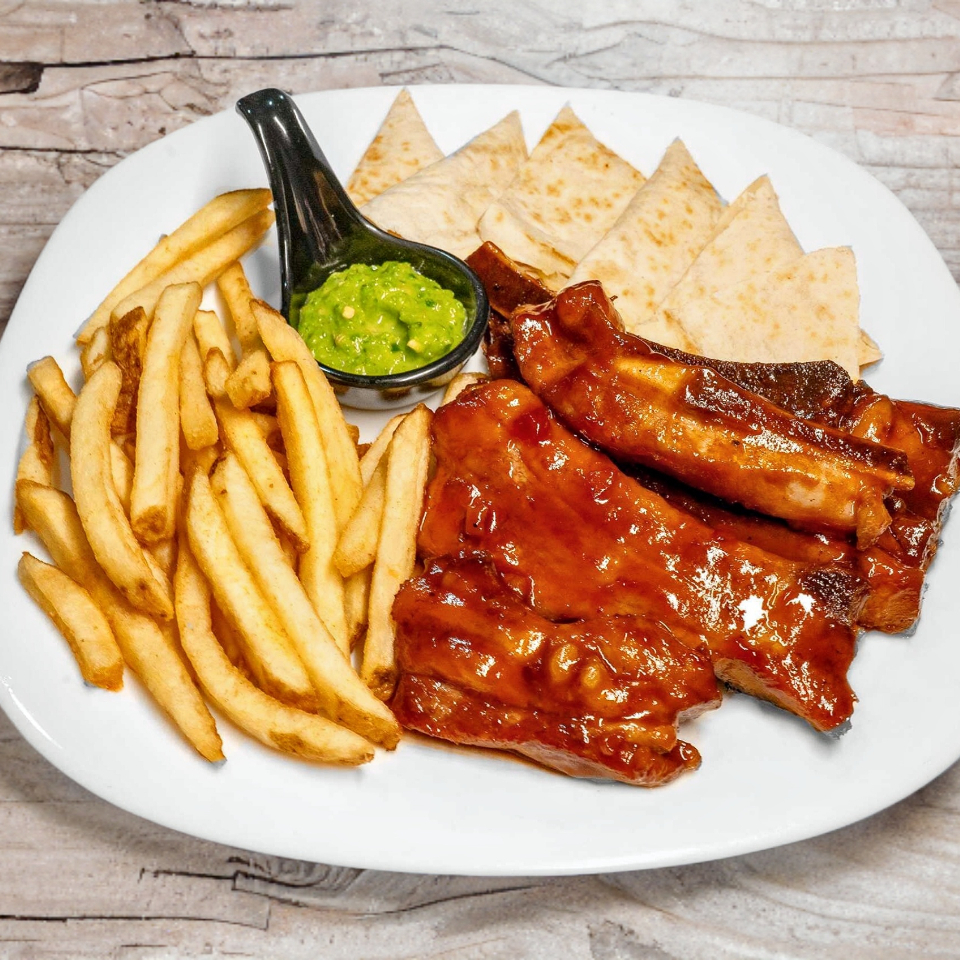 300 gramos costillas de cerdo acompañadas con papas a la francesa, dos quesadillas de queso oaxaca y guacamole.