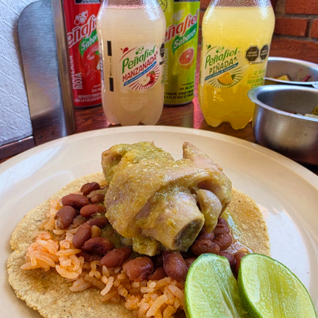 acompañado de arroz, frijoles de la olla, tortillas y salsa