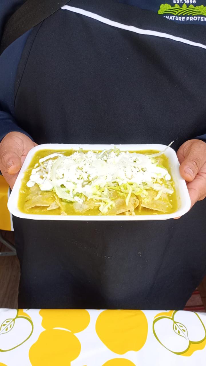 Delicioso chilaquiles bañados en salsa verde, queso, crema, lechuga, huevo estrellado, pollo, milanesa, ideal para dos personas