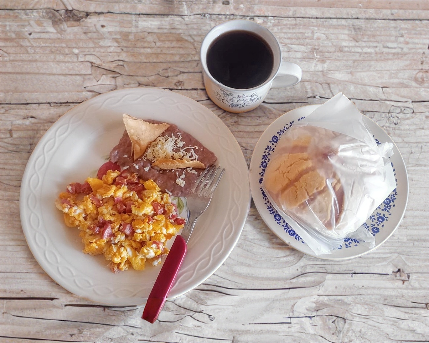 Huevos al gusto con pan de dulce, frijoles, tortillas y café de olla.
