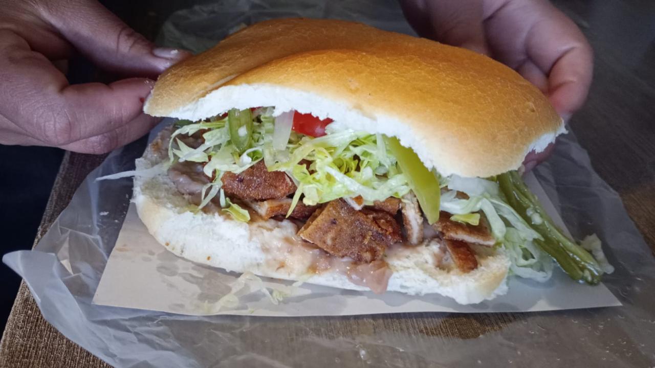 Torta de milanesa con frijoles, mayonesa, jitomate, cebolla y picante