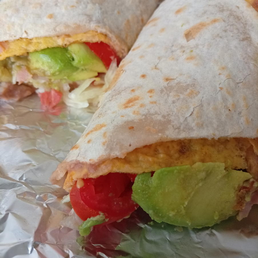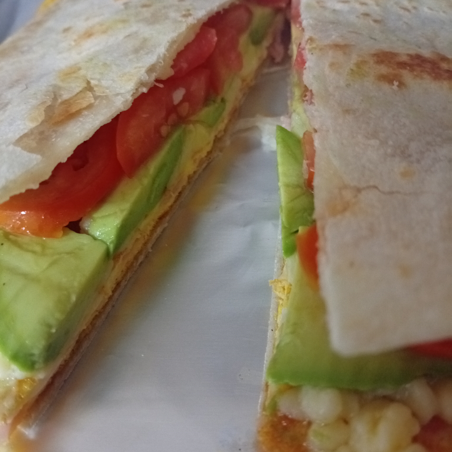 Tortilla harina, huevo,queso mozarella,aguacate,jitomate,salsa
