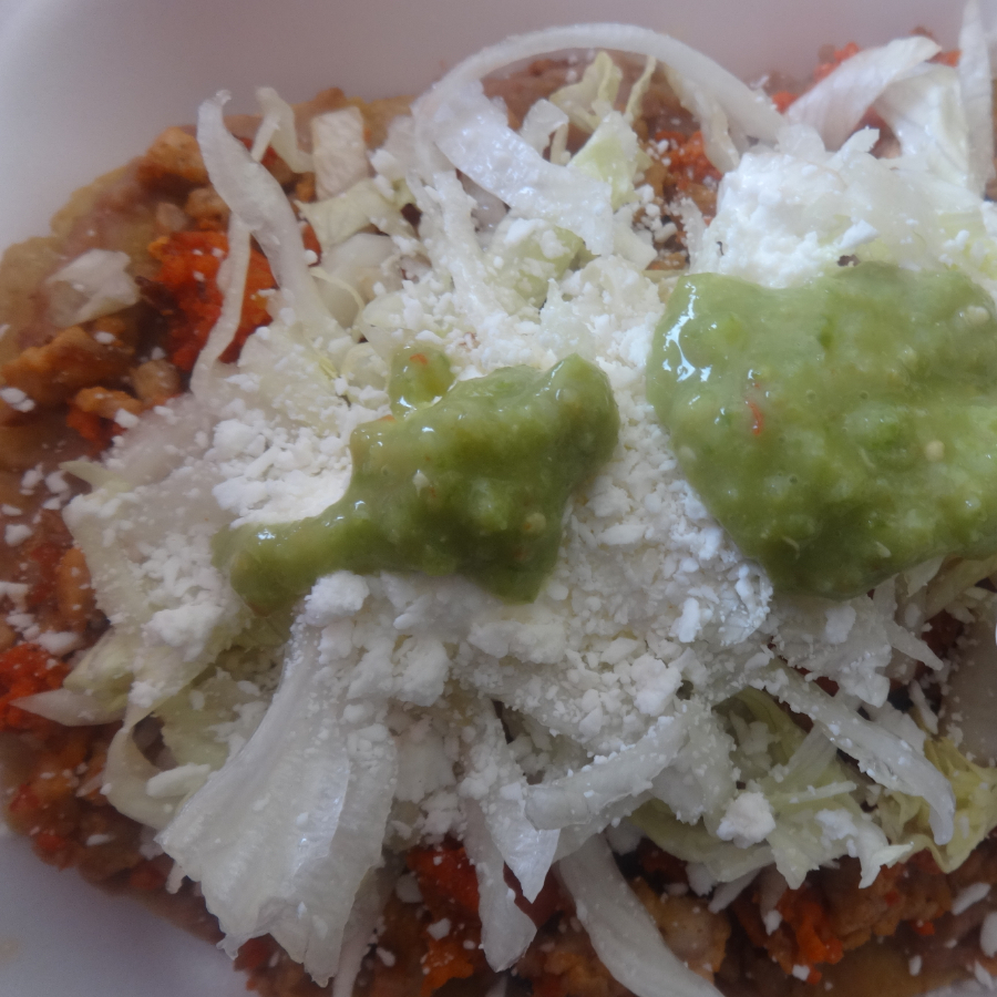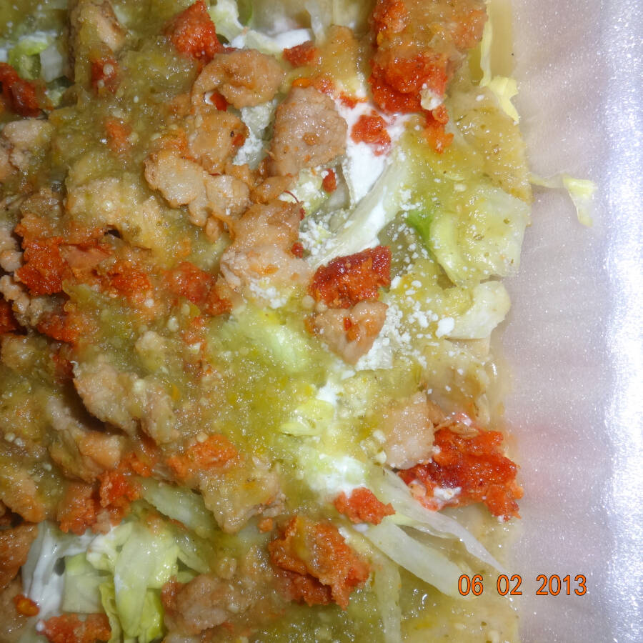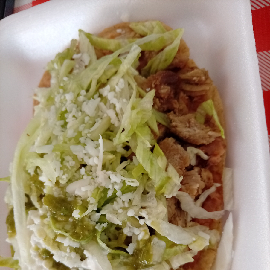 Hecho de masa,base frijol, longanisa, lechuga,queso,crema,salsa