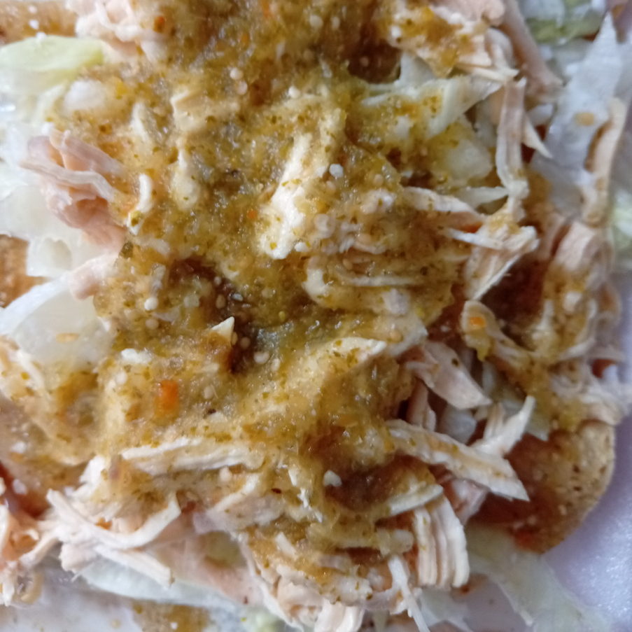 5pz de tortilla de maiz com pollo salsa verde,crema ,queso y lechuga