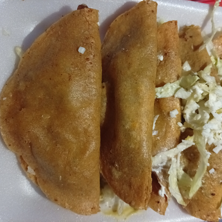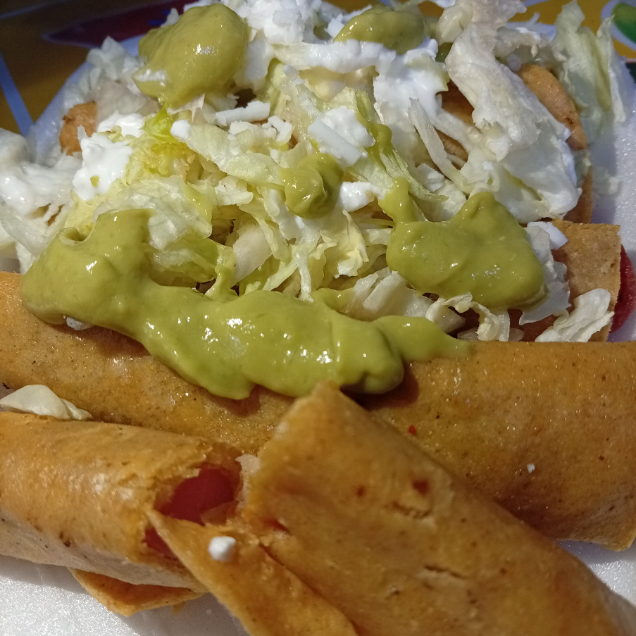 4 pzs tortilla con frijol doradas,lechuga,queso,crema, salsa