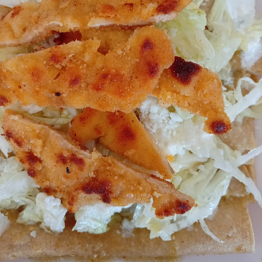 Totopos en salsa,lechuga,queso,crema,milanesa de pollo