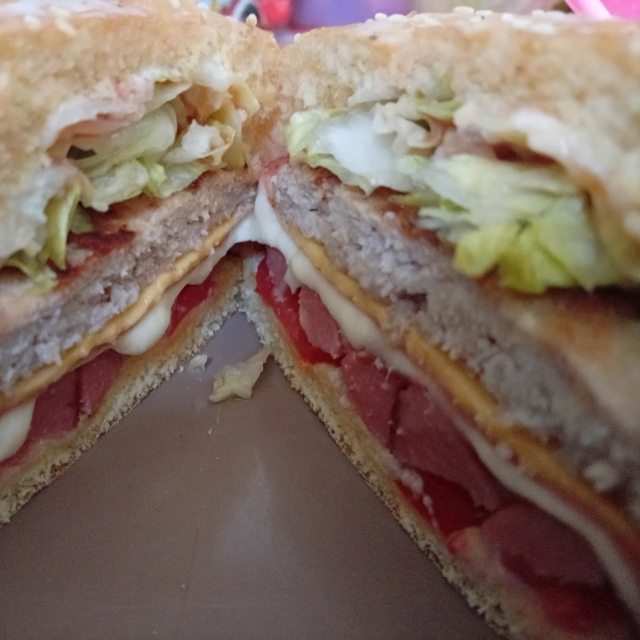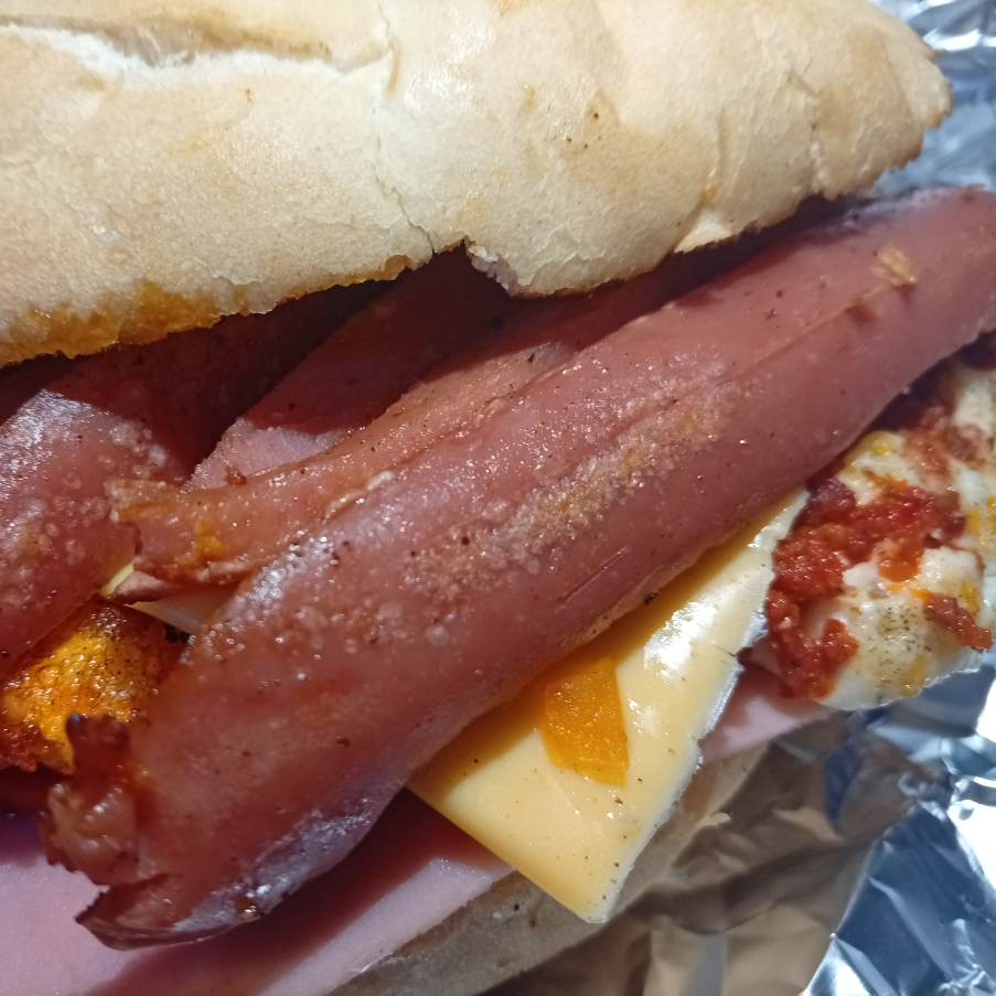 Pan,mayonesa, q oaxaca, salchicha, carne bistec y longanisa,q mozarella, jitomate,chiles,y cebolla.