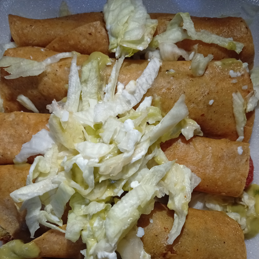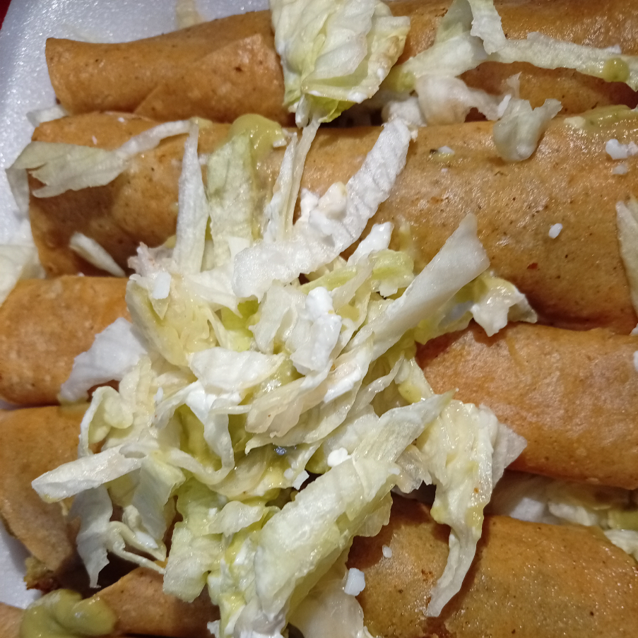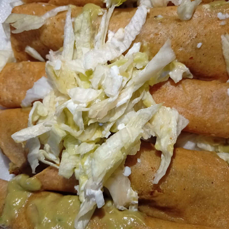 5 pzs de tacos dorados de mole verde,lechuga,queso,crema.salsa