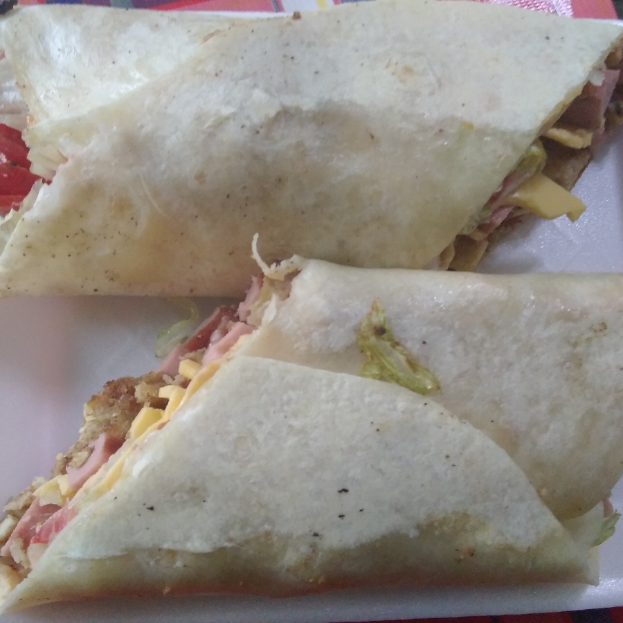 Tortilla de harina grande,frijoles,queso mosarella ,milanesa pollo,salchicha,q amarillo, jamon,lechuga,jitomate, salsa