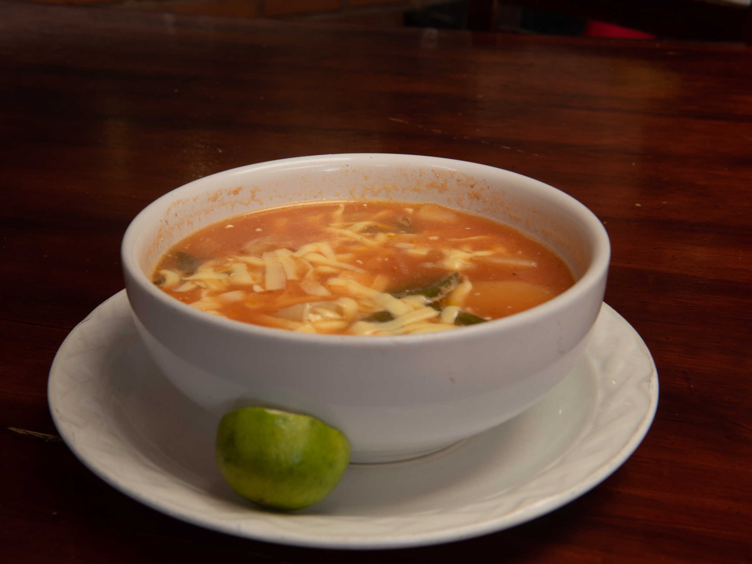 Caldo de jitomate, papa, rajas de chile poblano, cubitos de queso panela y un toque de queso chihuahua. Acompañado de tortillas de harina.