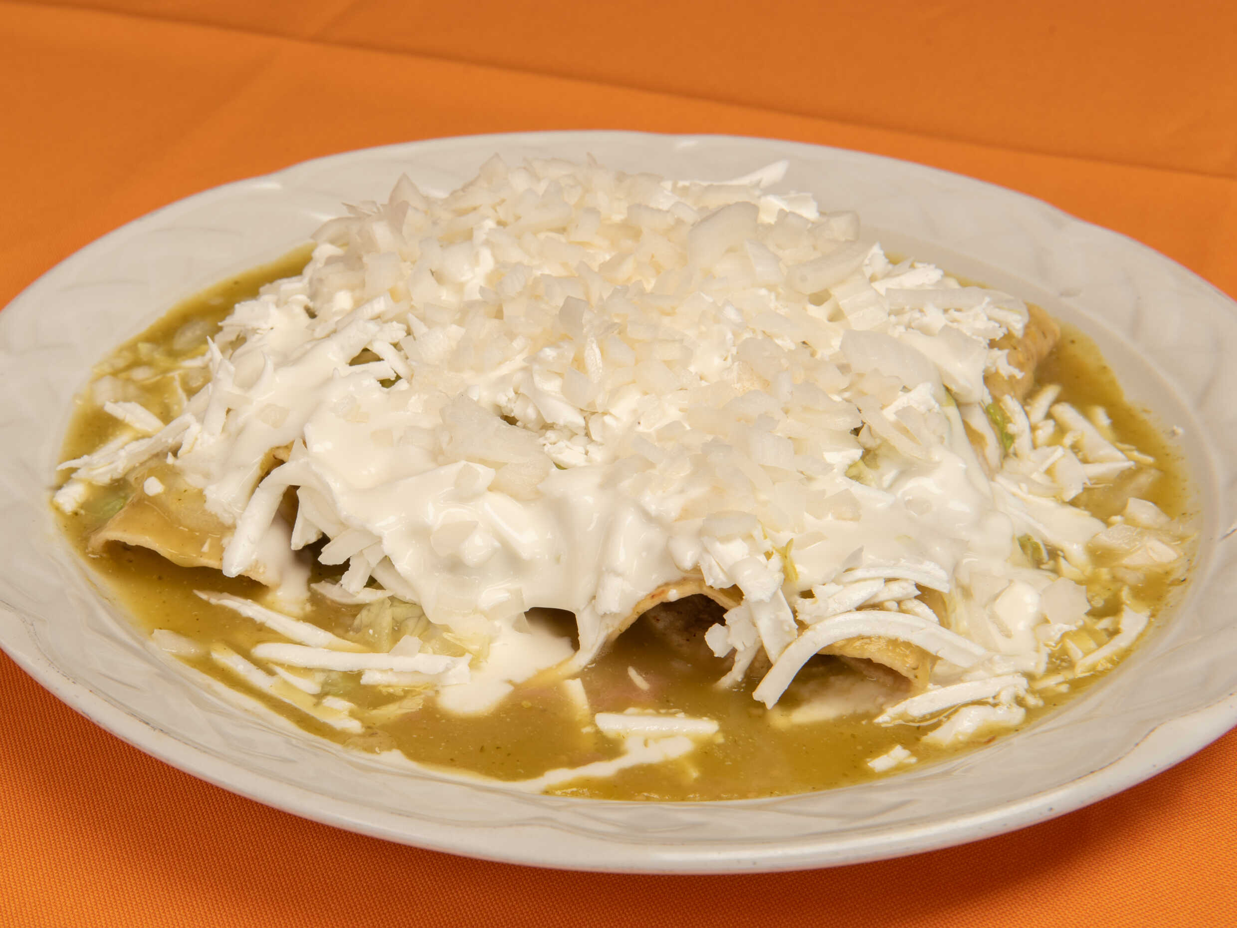 Tortilla envuelta y bañada en salsa verde, acompañada por tu proteína favorita, frijoles, queso rallado, crema y lechuga.