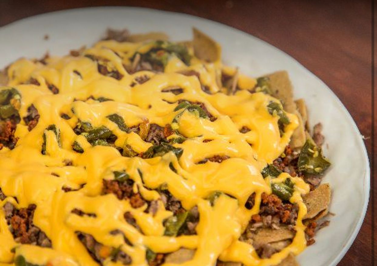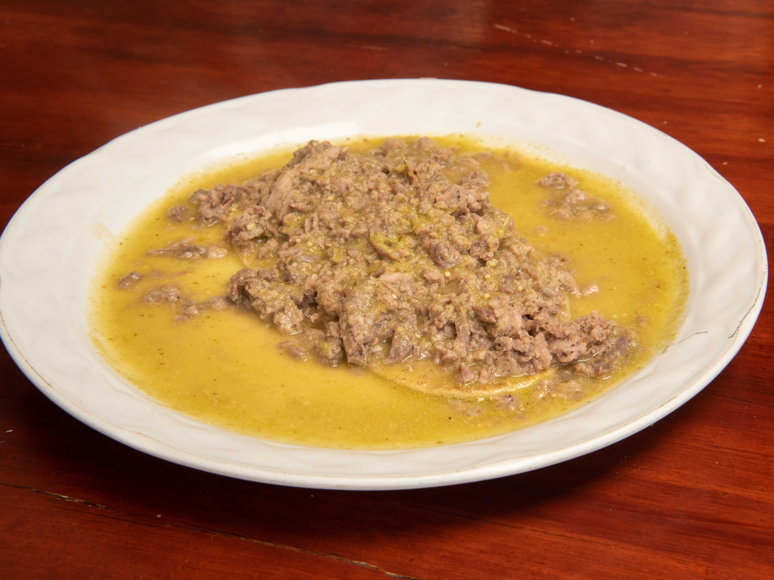 Tortilla frita, frijoles, chorizo, bistec, rodajas de chile jalapeño, aderezo amarillo y un toque de queso chihuahua.