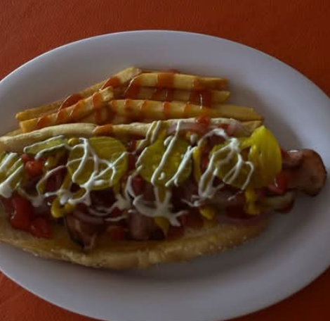 2 Salchichas, queso manchego, aderezo de la casa, cebolla morada, pepinillos, jitomate, jalapeños, mayonesa, mostaza, cátsup y papas a la francesa, picante.