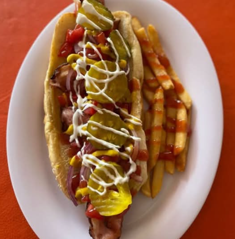 2 Salchichas, queso manchego, aderezo de la casa, tocino, cebolla morada, pepinillos, jitomate, jalapeños, mayonesa, mostaza, cátsup y papas a la francesa, picante.