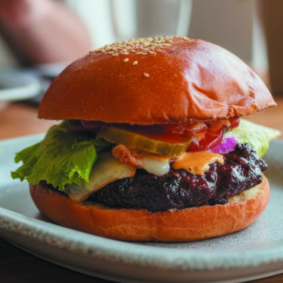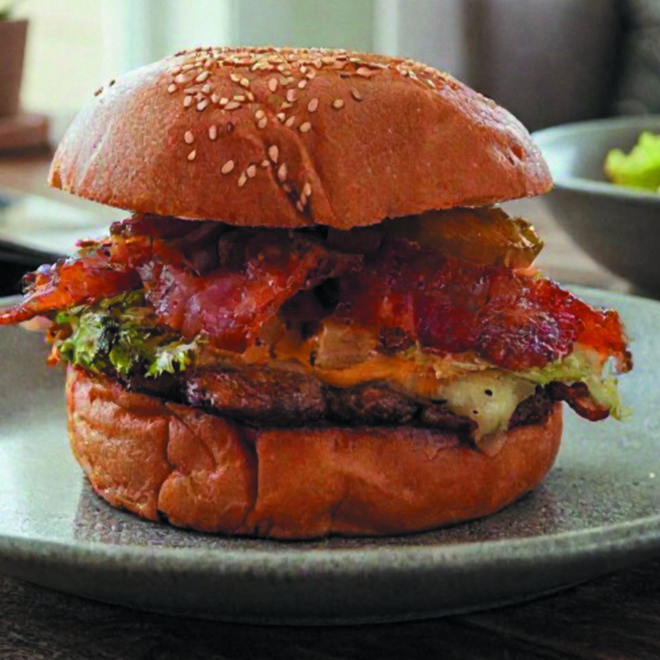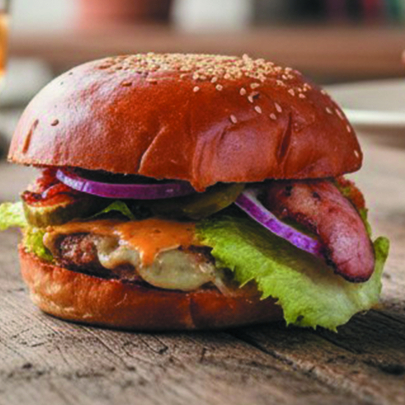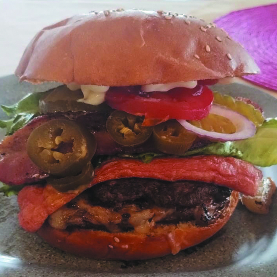 Dos Piezas de Carne 100% res, queso manchego, aderezo de la casa, lechuga italiana, cebolla morada, tocino crujiente, pepinillos, jitomate, jalapeños, mayonesa, mostaza y cátsup. Todos los ingredientes al doble, picante.