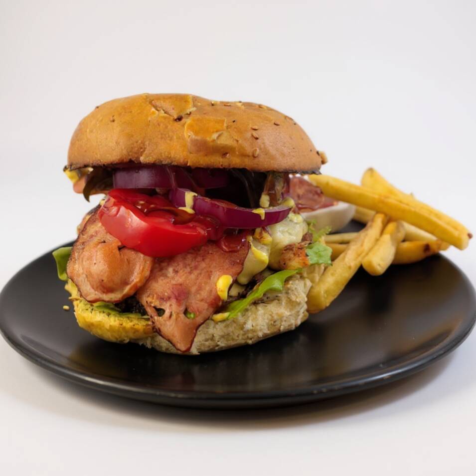 Hamburguesa de 360 gr aprox. hecha en pan artesanal elaborada con Tenders de pollo BBQ, queso manchego, aderezo de la casa, lechuga italiana, cebolla morada, pepinillos, jitomate, jalapeños, mayonesa, cátsup y picante.
