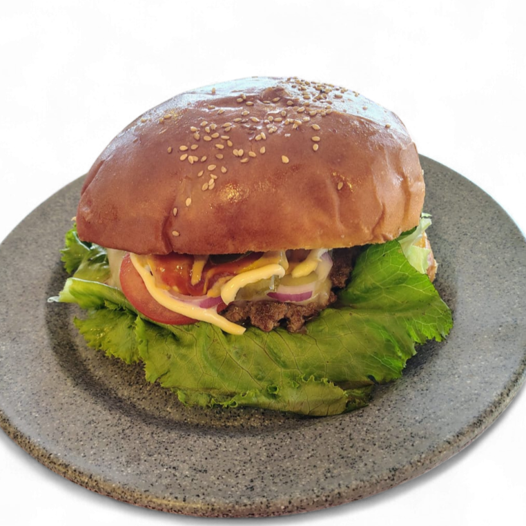 150 g De Carne 100% res, queso manchego, aderezo de la casa, lechuga italiana, cebolla morada, pepinillos, jitomate, jalapeños, mayonesa, mostaza y cátsup.