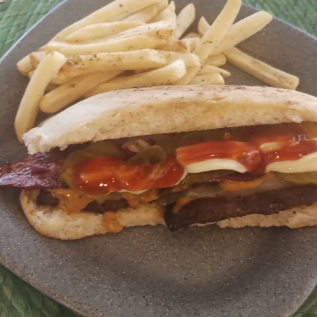 Carne de hamburguesa, queso manchego, aderezo de la casa, lechuga italiana, cebolla morada, tocino, pepinillos, jitomate, jalapeños, mayonesa, mostaza, cátsup y papas a la francesa, picante.